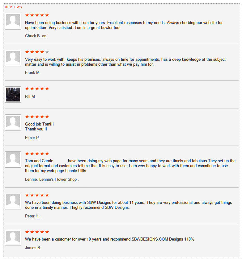 Our company is built on long term relationships, which means that we want to earn your trust and keep it. SBW Designs has been creating and hosting websites for the Small Business Community since 2001. Managed and owned by Tom Bender since 2001, the most important aspect is quality and service. |